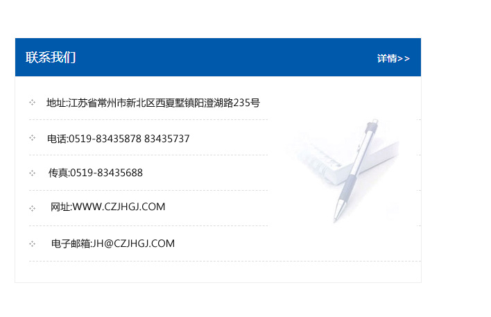 地址:常州市新北區友邦商務大廈1幢16、17層  電話:0519-85101652  傳真:0519-85112595  郵編:213022  網址:www_cz-jiayue_cn.hnyajufc.com  郵箱:xiajifengaa@163.com